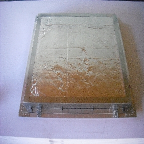 A tampa do alçapão tem em toda a volta uma estrutura metálica em L que bloqueia a lã-de-rocha de 60 mm 80kg/m3 coberta de alumínio. Deste modo, é garantida a manutenção da posição do isolante independentemente das diversas manipulações feitas no alçapão durante os acessos de manutenção ou outros.A lã confere. ainda, um bom isolamento térmico.